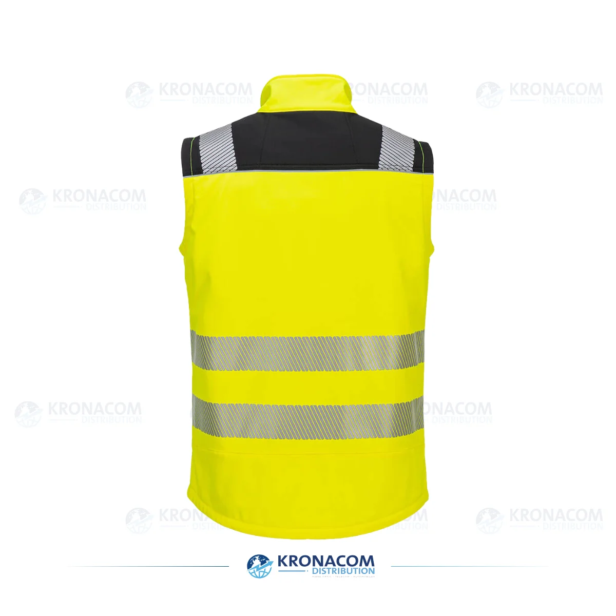 Moderne PW3 Hi-Vis Softshell Weste (3L) mit atmungsaktivem, wind- und wasserabweisendem 3-Lagen-Stoff, HiVisTex Pro Reflexstreifen, 4 Taschen und praktischen Funktionen für Profis im Außeneinsatz.